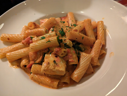 Rigatoni D is the best pasta. Had it again this time. Also had the bone-in ribeye which was super yum. Comes with mashed potatoes and asparagus. The chicken parmigiana was above average but not stellar. The tomato sauce was kind of thick and a little bland.